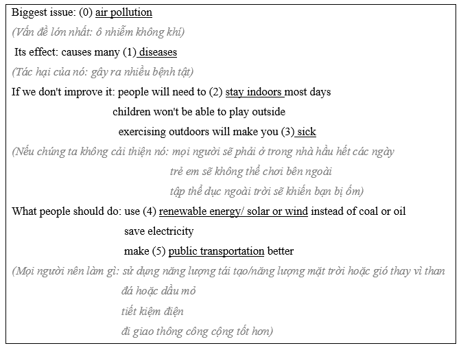 Ô nhiễm là một vấn đề ở nhiều nơi. Nhưng ô nhiễm không khí ảnh hưởng đến thị trấn của chúng tôi nhiều nhất. Nó gây ra nhiều bệnh tật. Mỗi năm có hàng ngàn người chết vì ô nhiễm không khí. Nếu chúng tôi không làm bất cứ điều gì để cải thiện nó, chúng tôi sẽ phải ở trong nhà hầu hết các ngày. Trẻ em sẽ không thể chơi bên ngoài. Và tập thể dục ngoài trời sẽ khiến bạn bị ốm. Vậy chúng ta có thể làm gì để giảm ô nhiễm không khí? Các nhà máy điện thường gây ra nhiều ô nhiễm không khí. Chính phủ của chúng ta nên sử dụng năng lượng tái tạo như năng lượng mặt trời hoặc gió thay vì than đá hoặc dầu mỏ. Mỗi chúng ta nên tiết kiệm điện vì cần rất nhiều năng lượng để tạo ra điện. Thị trấn nên làm cho phương tiện giao thông công cộng tốt hơn để mọi người sẽ sử dụng nó nhiều hơn. Nếu tất cả chúng ta đều đi bộ, đi xe đạp hoặc sử dụng phương tiện giao thông công cộng thì sẽ ít tắc đường và ô nhiễm không khí hơn.
