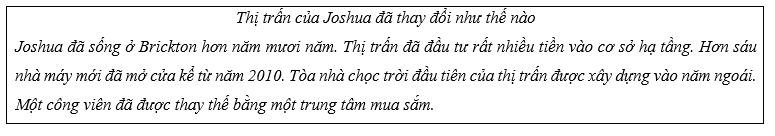 Joshua: Tên tôi là Joshua và tôi đã sống ở Brickton hơn năm mươi năm. Nó từng là một thị trấn nhỏ ở vùng nông thôn. Nhiều người sống trong cảnh nghèo khó. Đó không phải là một nơi đẹp để sống. Nhưng nó đã thay đổi rất nhiều kể từ đó. Thị trấn đã đầu tư rất nhiều tiền vào cơ sở hạ tầng. Họ đã xây dựng một đường cao tốc mới khoảng mười lăm năm trước. Nó thực sự đã giúp ích rất nhiều. Hơn sáu nhà máy mới cũng đã được mở kể từ năm 2010. Rất nhiều người đã chuyển đến khu vực này để làm việc trong các nhà máy. Thị trấn bây giờ rất hiện đại và sầm uất. Họ thậm chí còn xây dựng tòa nhà chọc trời đầu tiên vào năm ngoái. Tuy nhiên, nhiều nông dân đã bán đất và chuyển về nông thôn. Đất của họ đã được dùng để xây thêm nhà cho tất cả người dân mới. Tôi thực sự thích hầu hết những thay đổi đã xảy ra, nhưng đường phố vẫn cũ. Chúng không đủ tốt cho một thị trấn đông đúc như vậy. Bây giờ tôi phải mất nhiều thời gian hơn để lái xe đến siêu thị. Họ cũng xây dựng một trung tâm mua sắm ở nơi từng là công viên. Tôi từng thích đi dạo cùng cháu gái quanh đó. Tôi thực sự hy vọng họ sẽ mở một công viên mới ở một nơi khác.
