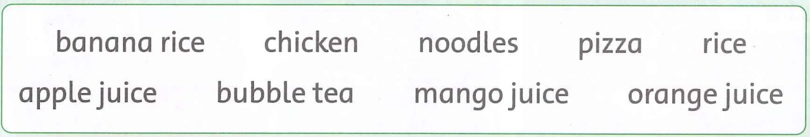 (Trao đổi thực đơn với bạn của bạn. Nói về thức ăn và đồ uống bạn muốn cho bữa trưa. Viết.)