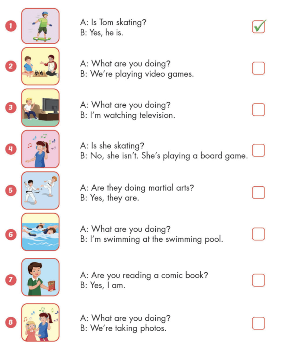 My name’s Lan, and I’m from Nha Trang in Vietnam. I have lots of friends. They like doing different activities after school. I’m skating at the skate park. Duy is playing video games at the arcade. Hoa is dancing at the studio. Khanh is reading at the bookstore. Nam is flying a kite at the soccer field.