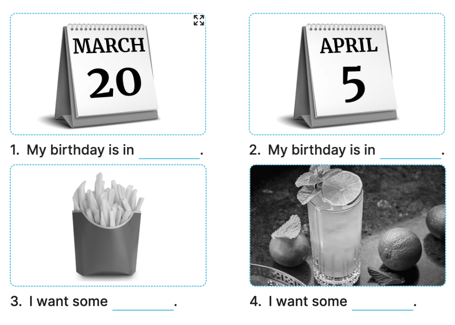 I have a friend. His / Her name is ______________. He/ She is from ____________. His / Her hobby is _____________. His/ Her birthday is in ________________. He / She wants____________ at his /her birthday party.