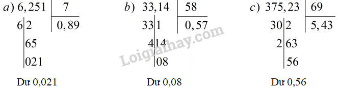 Thực hiện phép tính chia (lấy đến hai chữ số ở phần thập phân của thương) sau đó ta dóng một đường thẳng từ dấu phẩy của số bị chia ban đầu để tìm số dư của các phép chia đó.