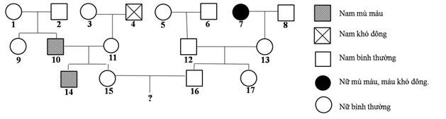 Câu 38: Cho sơ đồ phả hệ sau đây về bệnh mù màu và máu khó không. Biết rằng bệnh mù màu do gen lặn a gây ra, còn bệnh máu khó đông do gen lặn b gây ra. Các gen trội tương ứng là A, B quy định tính trạng bình thường. Các gen này nằm trên vùng không tương đồng của nhiễm sắc thể  X với khoảng cách 20cm. Theo lí thuyết, có bao nhiêu phát biểu sau đây đúng?