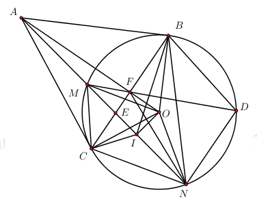 Bài 4 (3,5 điểm): Cho đường tròn (O;R) và điểm A ở bên ngoài đường tròn đó. Kẻ cát tuyến AMN không đi qua O (M nằm giữa A và N). Kẻ hai tiếp tuyến AB, AC với (O;R) (B, C là hai tiếp điểm và C thuộc cung nhỏ MN). Đường thẳng BC cắt MN và AO lần lượt tại E, F. Gọi I là trung điểm của MN.