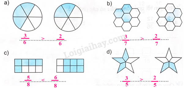 So sánh hai phân số chỉ số phần đã tô màu của mỗi hình.