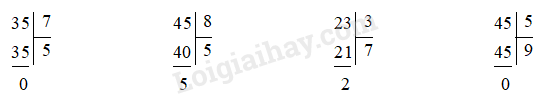 Thực hiện phép chia rồi tô màu đỏ vào ô ghi phép chia hết, màu vàng vào ô ghi phép chia có dư.