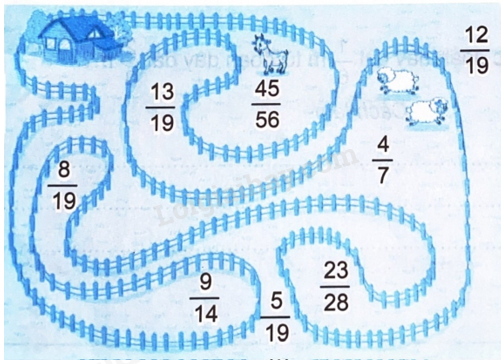 b) Các phân số ở trong hàng rào là: $\frac{{45}}{{56}}$ ; $\frac{4}{7}$ ; $\frac{9}{{14}}$ ; $\frac{{23}}{{28}}$