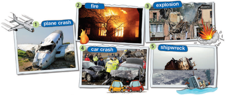 1. Listen and repeat. 2 a) Listen and repeat. b) Choose the correct options. 3. Listen to an interview about a plane crash and complete the gaps (1-4). 4. Imagine you experienced the plane crash in Exercise 3. Tell your partner what happened and how you felt.