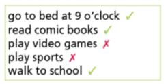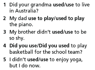 1. Choose the correct option. 2. Write sentences as in the example. Use used to or didn’t use to. 3. Correct the sentences with the correct form of used to and the verbs in brackets. 4. Choosse the correct option. 5. Look at the picture. Complete the questions and answer them using quantifiers.