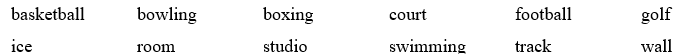 1. Complete the sports venues with the words below. Then use six of them to label the photos.