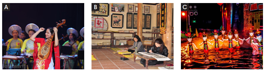 (Tôi có biết các hình thức giải trí này. Bức ảnh A là buổi biểu diễn nhạc cụ truyền thống, bức ảnh B là cảnh vẽ tranh đông hồ còn bức ảnh C là buổi biểu diễn múa rối nước.)
