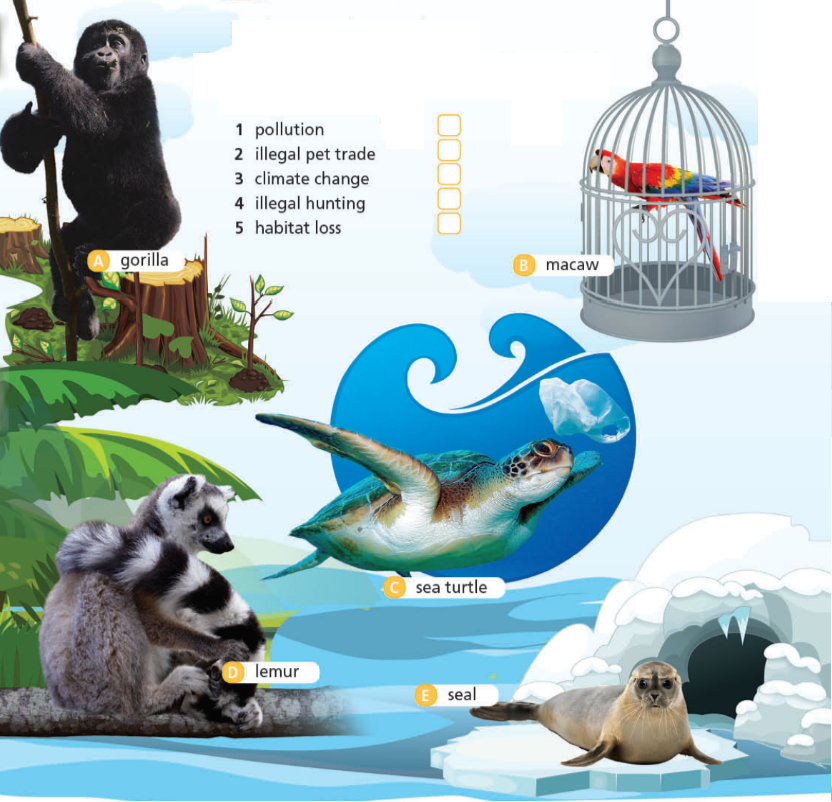 1. Listen and repeat. Why are these animals endangered? Look at the pictures, guess and choose from the list. 2. Listen to a radio show. Why are the animals in Exercise 1 endangered? Match the reasons (1-5) to the animals (A-E). 3. Ask and answer as in the example.