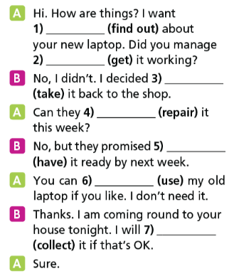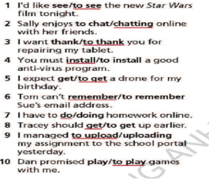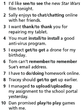 1. Choose the correct option. 2. Put the verbs in brackets into to-infinitive or infinitive without to. 3. Put the verbs in brackets into to infinitive, infinitive without to, Ving form. 4. Find eight grammar mistakes in the email and correct them.
