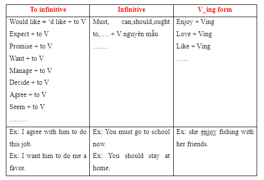 Infinitive (to – infinitive, infinitive without to)/ -ing form.