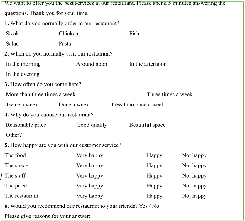 1. What 2. When 3. Why 4. How often 5. How happy 6. Would – recommend