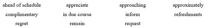 adjacent to (bên cạnh), due to (vì), prior to (trước), beverages (đồ uống), to commence (bắt đầu), to depart (khởi hành), to proceed to (đi đến), to purchase (mua), refreshments (đồ ăn thức uống), to terminate (kết thúc))