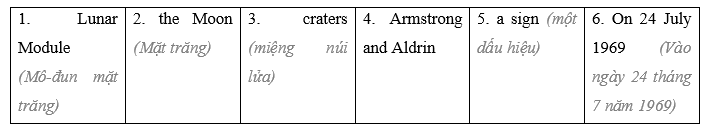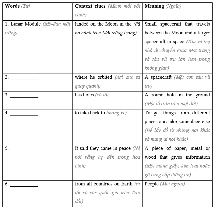 (Đọc lại văn bản và sử dụng các manh mối ngữ cảnh để tìm các từ trong văn bản để hoàn thành biểu đồ bên dưới.)