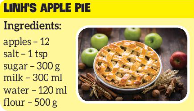 3. Work in pair. Ask and answer about the ingredients for Linh’s apple pie, using the quantities in the recipe.