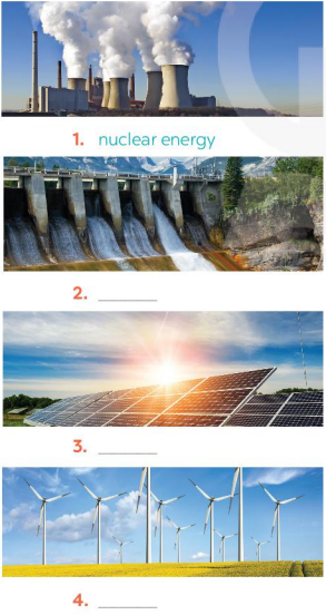 1.Match the types of energy in A with the energy sources in B. 2. Write the phrases to label the pictures. 3.Complete the sentences with the words and phrases from 1 or 2. 4. Listen and repeat. Pay attention to the stressed syllables in the words. 5. Listen and repeat, paying attention to the stressed syllables in the underlined words.