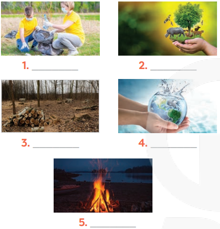 1. Label each picture with a phrase from the list. Tick (✓) the actions above that protect the environment. 2. Match each word or phrase in column A with its meaning in column B. 3. Complete each sentence with a word or phrase from the box. 4. Listen and repeat the words. Pay attention to the sounds /bl/ and /kl/. 5. Listen and practise the sentences. Underline the words with /bl/, and circle the words with /kl/.