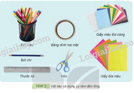 Em hãy lựa chọn các vật liệu với số lượng phù hợp và dụng cụ cần thiết có trong Hình 2 để làm đèn lồng.
