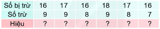 – Học sinh có thể tính nhẩm tương tự như các bài trước để hoàn thành các phép trừ dạng 16, 17, 18  trừ đi một số.
