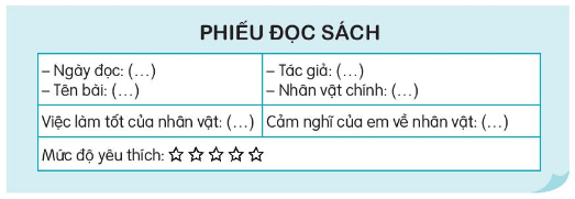 Đọc câu chuyện, bài văn, bài thơ về một việc làm tốt và viết phiếu đọc sách theo mẫu. Chia sẻ với bạn về việc làm tốt của nhân vật trong bài đã đọc.