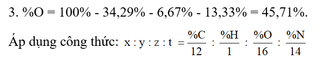 Hợp chất hữu cơ A có chứa carbon, hydrogen, oxygen, nitrogen. Thành phần phần trăm khối lượng của nguyên tố carbon, hydrogen, nitrogen lần lượt là 34,29%, 6,67%, 13,33%. Công thức phân tử của A cũng là công thức đơn giản nhất. Xác định công thức phân tử của A.