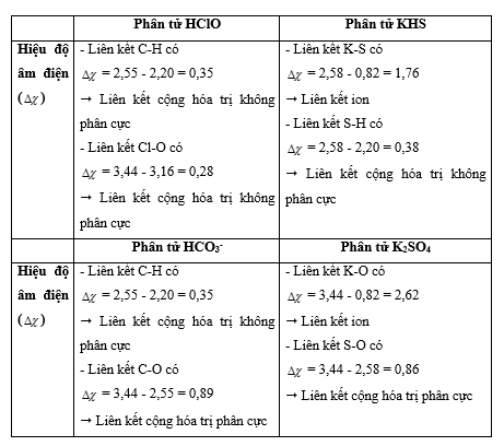 Dựa vào giá trị của độ âm điện ở Bảng 6.2 trong sách giáo khoa Hóa học 10, hãy nêu bản chất liên kết trong các phân tử và ion sau: HClO, KHS, HCO3–, K2SO4.