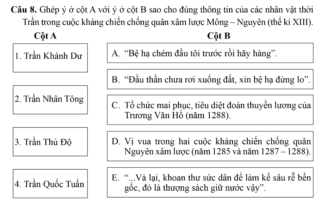 Câu 1. Hành động nào sau đây của vua Trần (năm 1257) thể hiện rõ ý chí, thái độ kiên quyết chống lại cuộc xâm lược của quân Mông Cổ?