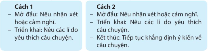 + Cách 2: Mở đầu: nêu nhận xét hoặc cảm nghĩ; triển khai: nêu các lí do yêu thích hoặc không yêu thích câu chuyện; kết thúc: tiếp tục khẳng định ý kiến về câu chuyện.
