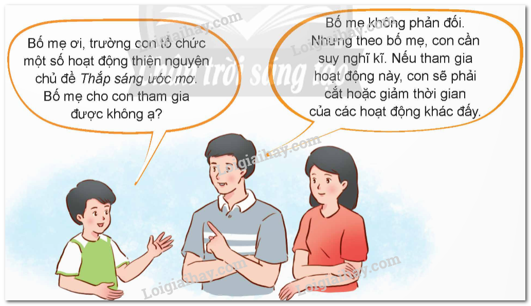 b. Bố mẹ trả lời bạn: Bố mẹ không phản đối. Nhưng con cần suy nghĩ kĩ vì khi tham gia hoạt động này, con phải cắt hoặc giảm thời gian các hoạt động khác.