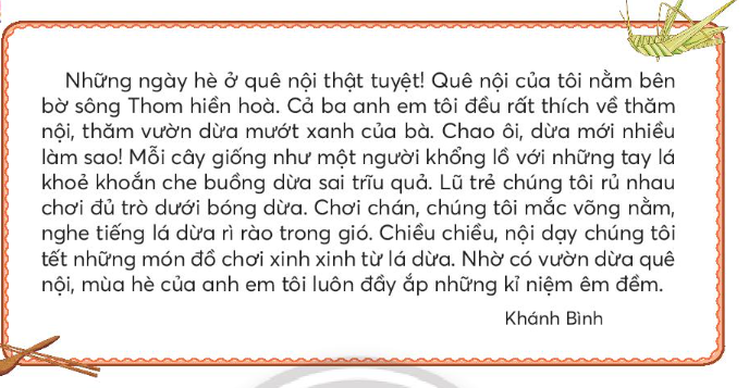 Cả 3 anh em tôi đều rất thích về thăm nội, thăm vườn dừa xanh mướt của bà tết những món đồ chơi xinh xinh từ lá dừa. Nhờ có vườn dừa quê nội, mùa hè của anh em tôi luôn đầy ắp những kỉ niệm êm đềm.