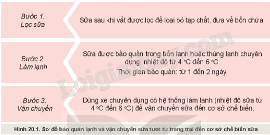 Quan sát Hình 20.1 và nêu tóm tắt các bước bảo quản sữa tươi từ trang trại đến cơ sở chế biến sữa.