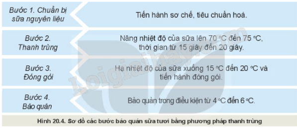 Quan sát Hình 20.4 và mô tả các bước bảo quản sữa tươi bằng phương pháp thanh trùng.