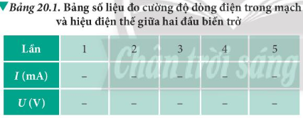 Bước 5: Thay đổi giá trị R của biến trở, ứng với mỗi giá trị của biến trở, đọc giá trị của I và U tương ứng, ghi số liệu vào Bảng 20.1.