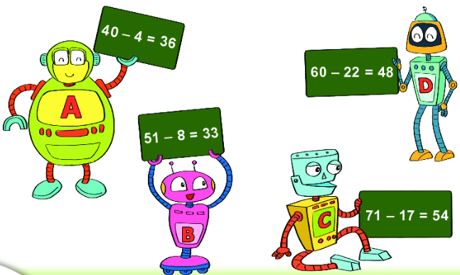 Thực hiện từng phép tính ghi trên bảng của mỗi bạn Rô-bốt, từ đó tìm được bạn nào cầm bảng ghi phép tính đúng