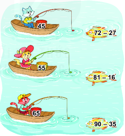 Mỗi con mèo sẽ câu con cá ghi phép tính có kết quả là số ghi trên xô. Tìm cá cho mỗi con mèo.