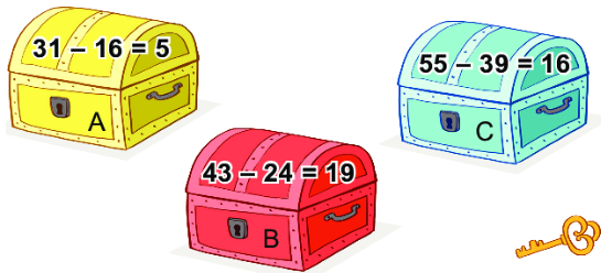 Chìa khoá mở được chiếc hòm ghi phép tính đúng nhưng không mở được chiếc hòm màu xanh. Chìa khoá mở được chiếc hòm nào?