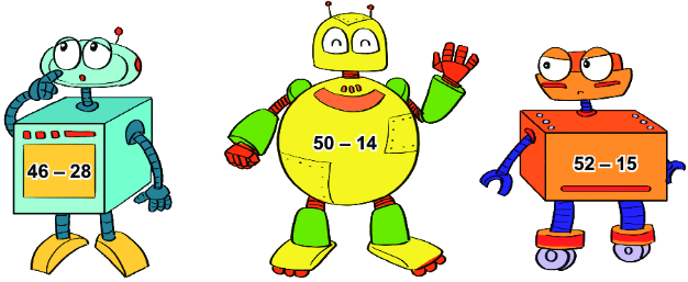 a) Rô-bốt có thân dạng khối lập phương ghi phép tính  46 – 28.