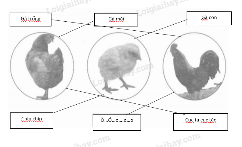 Em quan sát ba bức tranh về ba con gà và hãy chỉ ra đâu là con gà trống, con mái và gà con. Chúng có tiếng kêu như thế nào?