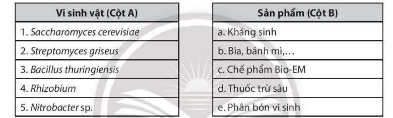 Hãy nối tên vi sinh vật ở cột A với sản phẩm được tạo thành ở cột B sao cho phù hợp.
