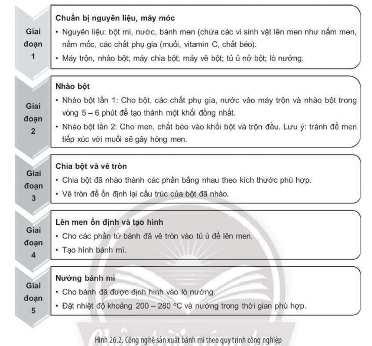 Hình 26.2 mô tả công nghệ sản xuất bánh mì theo quy trình công nghiệp. Quan sát hình và thực hiện các yêu cầu bên dưới.