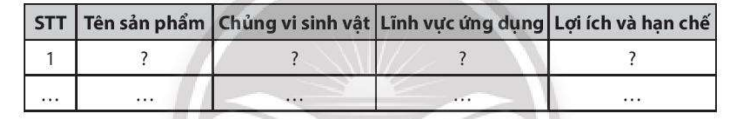 Hãy tiến hành điều tra thông tin về một số sản phẩm thương mại có ứng dụng công nghệ vi sinh vật trên thị trường hiện nay theo các nội dung sau: tên sản phẩm, chủng vi sinh vật được sử dụng, linh vực ứng dụng, lợi ích và hạn chế. Chia sẻ thông tin điều tra được cho các bạn cùng lớp nghe.