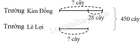 Trong lễ hội trồng cây, Trường Tiểu học Lê Lợi và Trường Tiểu học Kim Đồng trồng được tất cả 450 cây. Trường Tiểu học Lê Lợi trồng ít hơn Trường Tiểu học Kim Đồng là 28 cây. Hỏi mỗi trường trồng được bao nhiêu cây?