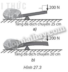 Một người sử dụng đòn bẩy để nâng một tảng đá trọng lượng 600 N lên bằng cách tác dụng một lực 200 N vào một đầu đòn bẩy làm cho đầu đòn bẩy này dịch chuyển 80 cm (Hình 27.3a).
