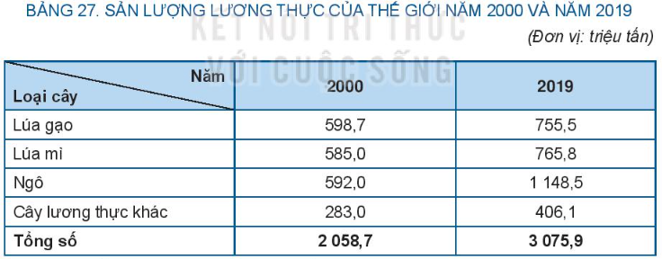 – Về quy mô, sản lượng lương thực thế giới có xu hướng tăng: năm 2000 đạt 2058,7 triệu tấn -> 2019 đạt 3075,9 triệu tấn, tăng thêm 1017,2 triệu tấn.