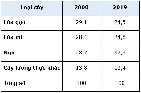 Bảng cơ cấu sản lượng lương thực thế giới năm 2000 và năm 2019 (%)