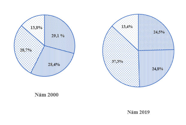 Biểu đồ quy mô và cơ cấu sản lượng lương thực thế giới năm 2000 và 2019 (%)