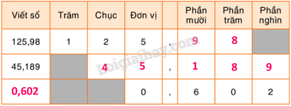 Trong các số thập phân dưới đây, mỗi chữ số thuộc hàng nào?